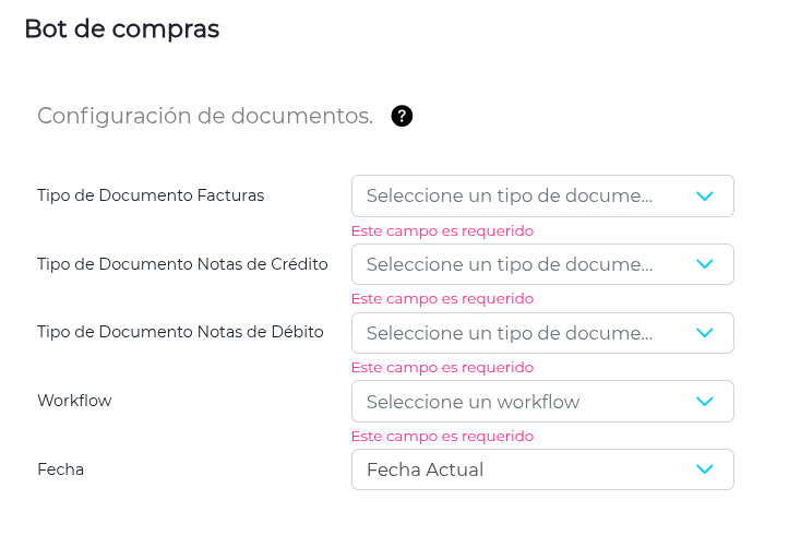 Falta de configuración de documentos base. No hay ningún tipo de documento cargado en la solapa de “Configuración de Documentos” del Bot.
